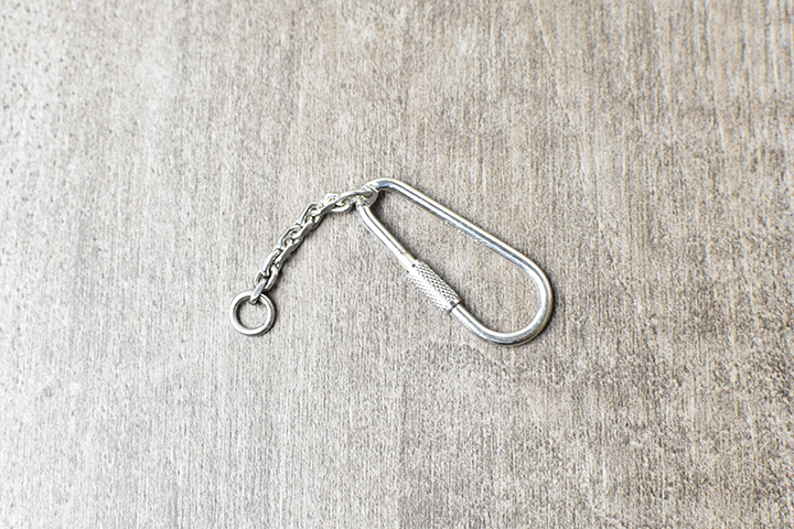 続いて、KEY CHAINとWILDSWANSのカラビナキーリング(S)を接続します。接続部分はKEY-CHAINの先端の小さなリングです。接続方法はカラビナキーリング(S)のレバーを開き、ここにKEY-CHAINの先端の小さなリングを通します。
