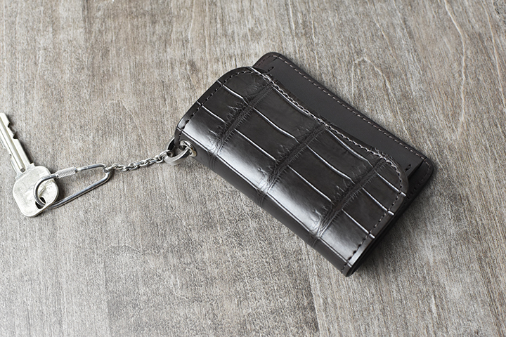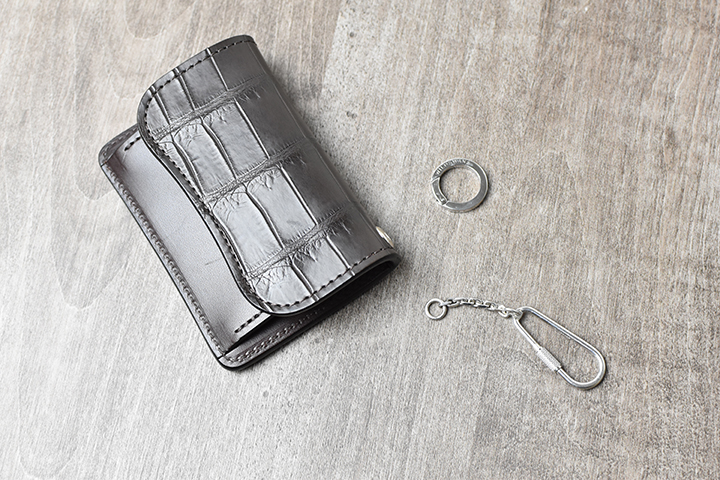 ちなみにこちらで使用しているTONGUE(EYELET)は、クロコダイルのチョコのタイプです。フラップの片側(画像では左側)にハトメ加工を施しているので、こちらにカラビナキーリング(S)を通して接続します。