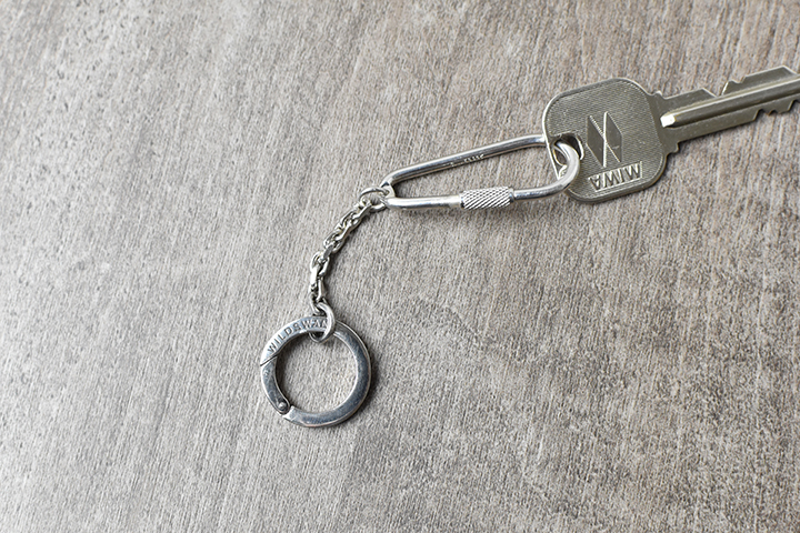 今回のKEY-CHAINでも、前回と同じシルバー925を採用しています。シルバー925は純度の高く、強度にも優れた銀のことです。この証として、ネジ式カラビナ部分にはシルバー925の刻印が入ります。サイズが若干変わりましたが、ほぼ前回と同じサイズ感です。また、前回のものは海外からの輸入品で、発売から間もなく廃番となってしまったため、今回は国産でこちらに代わるKEY-CHAINのご用意が整いました。