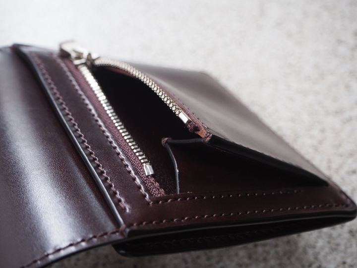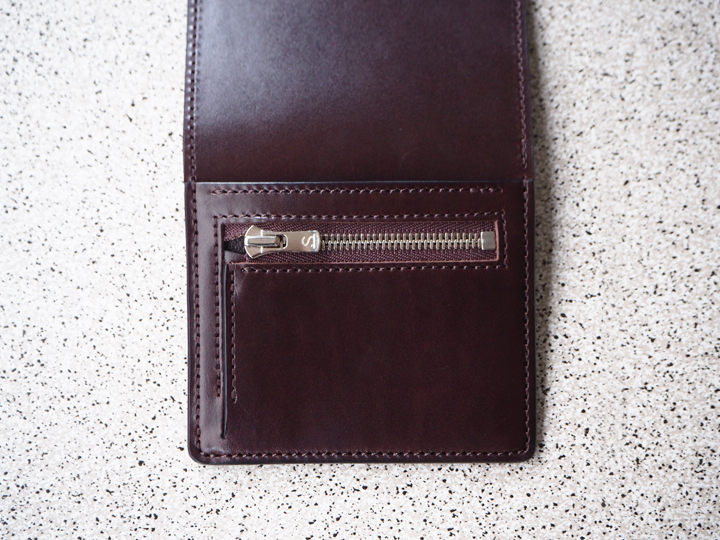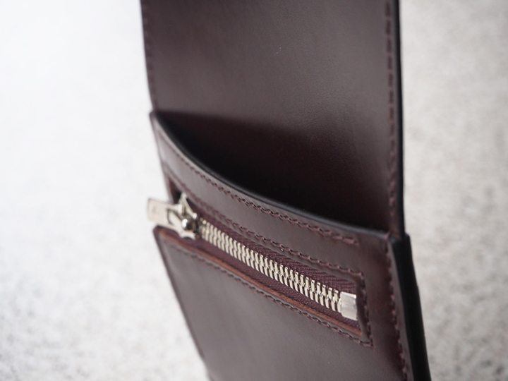 PRIMはカードと紙幣をメインに収めるためのミニウォレットですが、外側背面にはファスナーポケットが付いておりますので、こちらには少量のコインも収納できます。