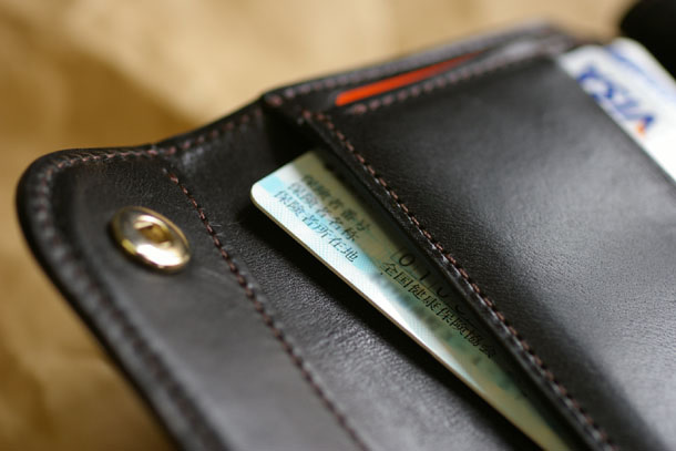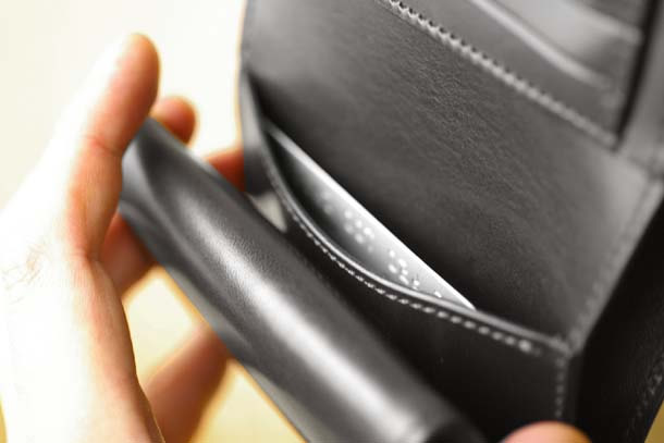 頻繁に使うカード3枚はやはりこの位置でしょうか。また、中型3つ折り財布のBYRNEと同様にこのカード段の裏側にはポケットが2つあります。