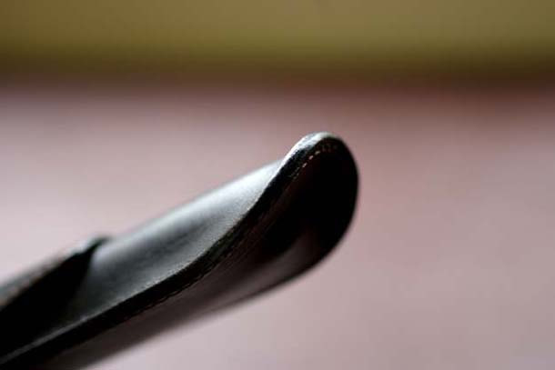 ケース先端部分のコバが車で言うバンパーの役割を果たすのは勿論ですが、何よりも革が描くフォルムがとても美しいケースです。