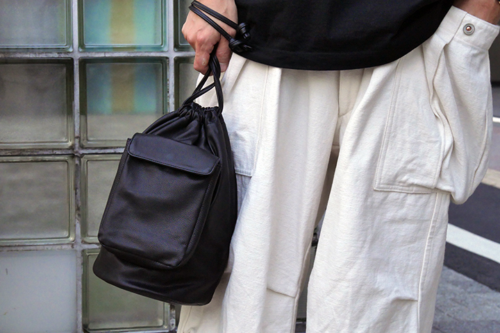 ドローストリングバッグ(大)・UNSAC(アンサック)はカーゴパンツに用いられるマチ付きポケットをデザインに落とし込んだ収納力に優れたバッグ。