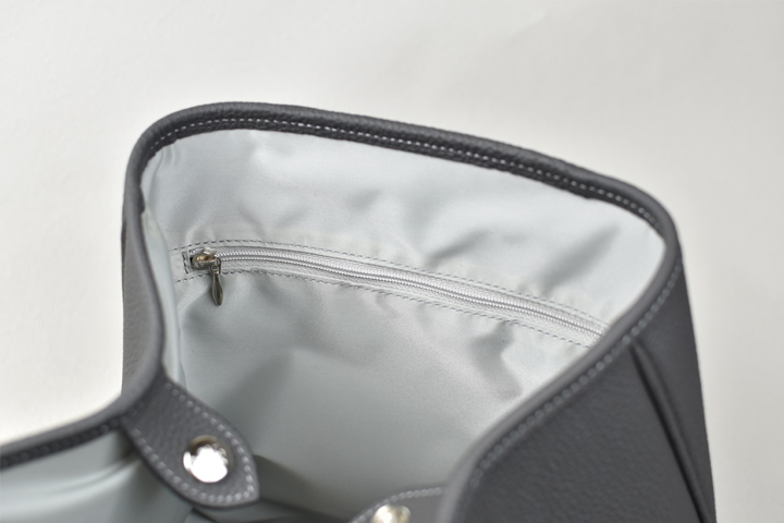 内装にはイタリア・リモンタ社の丈夫なナイロン生地を使用しており、品のある艶感で汚れにも強く、生地自体が明るい色味のために収納したものも見やすい構造になっています。