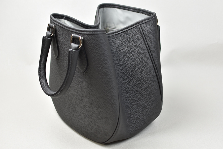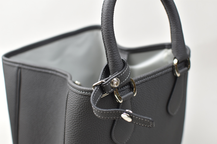 サイドのマチはジャンパーホック付きのパーツによって内側に畳まれ、プティトートの特徴的なフォルムを生み出します。