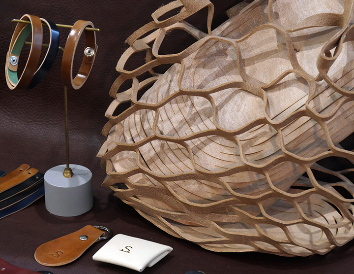 通常は皮革の展示やWILDSWANS製品のエイジングサンプル、