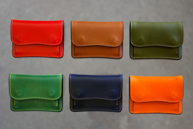 上の写真には有りませんがブラックとチョコレート色とナチュラルの3色はベルギーのサドルプルアップという革を使用していて、上の写真の中のレッド、グリーン、ネイビー、オレンジはイタリアのブッテーロという革を、またコニャックとオリーブグリーンは同じくイタリアのミネルバ・リスシオという革を使用しています。