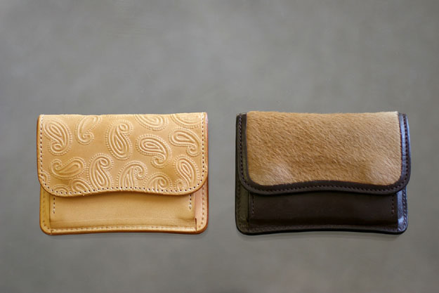 左はナチュラルの革にペイズリー柄の型押しを施したもので、長く使い込むと色が焼けてきますので、柄がより立体的に見えてくるという代物です。
