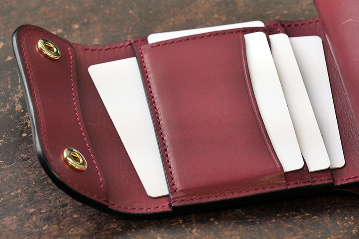 カードの厚みや大きさの違い、また使用とともに皮革が馴染むことで最大数は異なってまいりますが、お使い初めから十分な収納力が備わっているといえるのではないでしょうか。また、前身側のスペースには、三つ折りにした紙幣がすっぽりと収まりました。