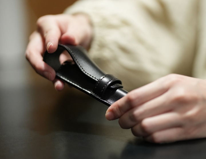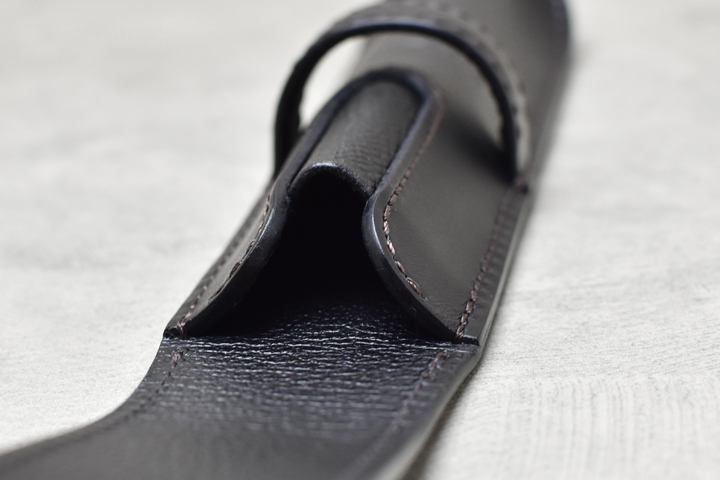 両サイドは皮革の張りによって内側へ入ろうとする力が加わり、ペンの収納時にケース内のぐらつきを抑え、支えるような仕組みになっています。