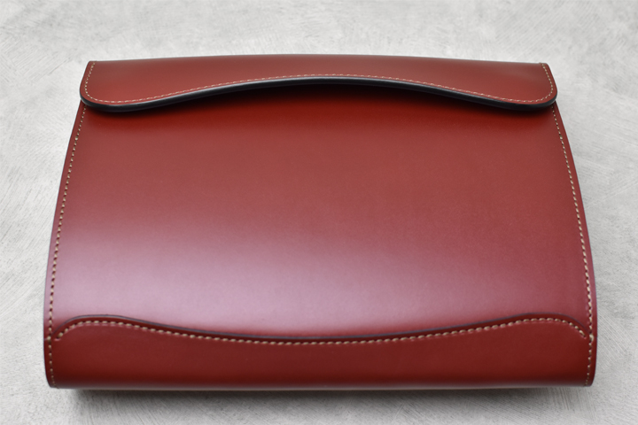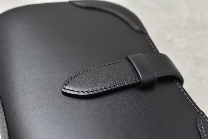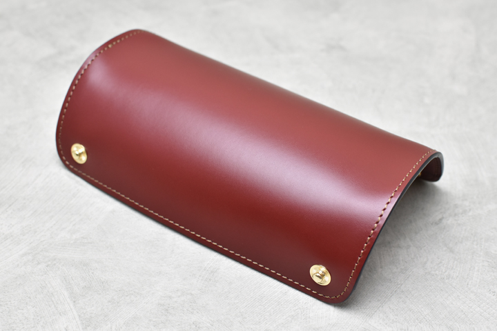 四角い外装の皮革が一周して両端のホックで留められ、筒状になっています。 皮革の風合いを活かすよう、装飾や切り返しのない一枚革が使用されています。