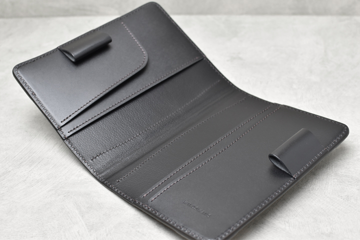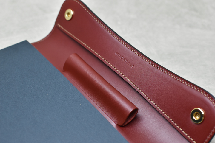 スペースは太軸のペンにも対応できるよう余裕を持った構造で、PELIKANのスーベレーン1000番などのペンも収納可能です。 内装のペンクリップが当たる部分には摩擦に強い型押しの皮革を使用しています。