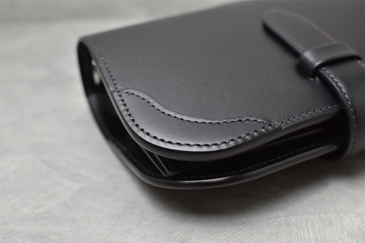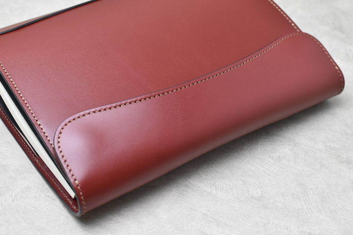 OWLの背表紙部分には背当てが取り付けられております。厚みを出して耐久性を高め、更に持つときに背当てパーツの段差が指に掛かってしっかりと掴める効果もあります。
