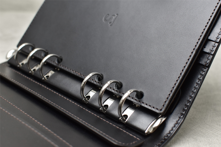 中央の6穴のバインダーは手の込んだ革巻き仕様で、バインダーには革製の下敷き(2枚セット)が標準装備されています。