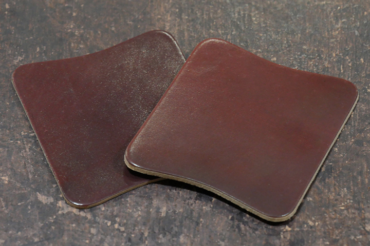 つるりとしたシェルコードバンの表面は、使い込むと鏡面のような強い輝きを生み出します。個体によって生じる新品時のざらつきや ぷつぷつとした毛穴(ピンホール)は、エイジングが進んで革表面の毛が寝かしつけられることで、徐々に目立たなくなっていきます。