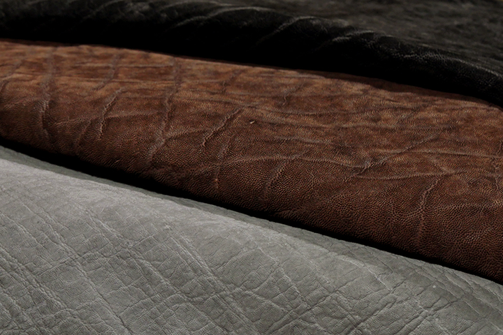 エレファントレザーはエキゾチックレザーの一種で、軽い素材でありながらも非常に高い耐久性も併せ持ちます。表面には特有のシボとシワが広がり、見た目の起毛感も相俟って独特な魅力を放っています。