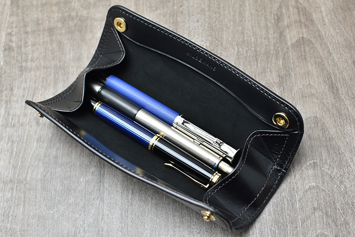 中軸のペンでしたら、大体3~4本程度収納が可能です。なお、ペンを収納する際は本体の両サイドのマチを立ててフラップを閉じます。