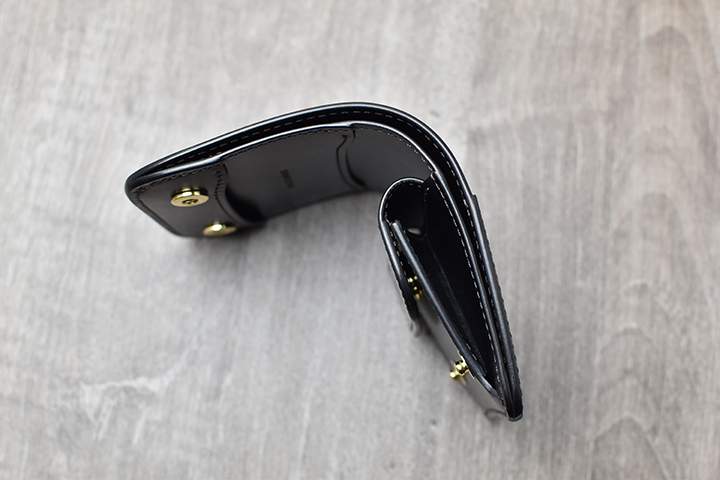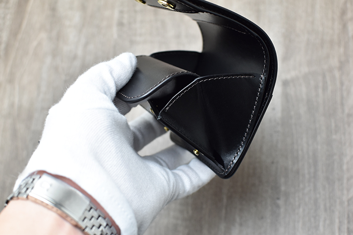 コインケースのフラップは、ひと際大きなマチを沿うように前後に大きく可動します。この特殊な仕様により、フラップの手前にコイン、背面にカードを仕分けて収納することができます。背面のカード収納部に複数枚のカードを収納しても、フラップの可動により、中身が見やすく、取り出しやすい設計になっています。