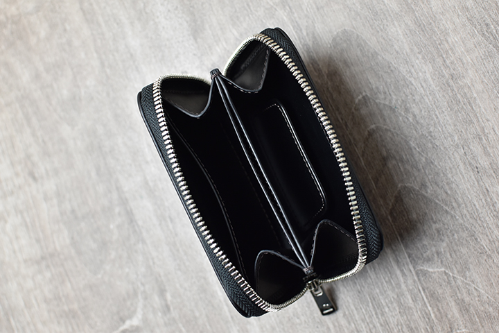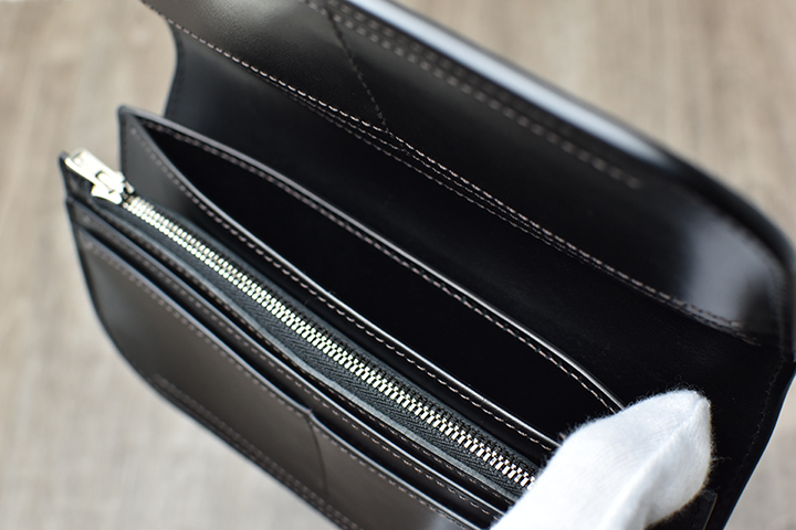 内装は4つの収納部から構成されています。画像左側から、マチなしポケット、両マチ式ポケット、中央に配置した舟形に開くポケット、仕切りが付いた両マチ式ポケットです。それぞれのスペースにカードやコイン、折りたたんだ紙幣が自在に収納できます。