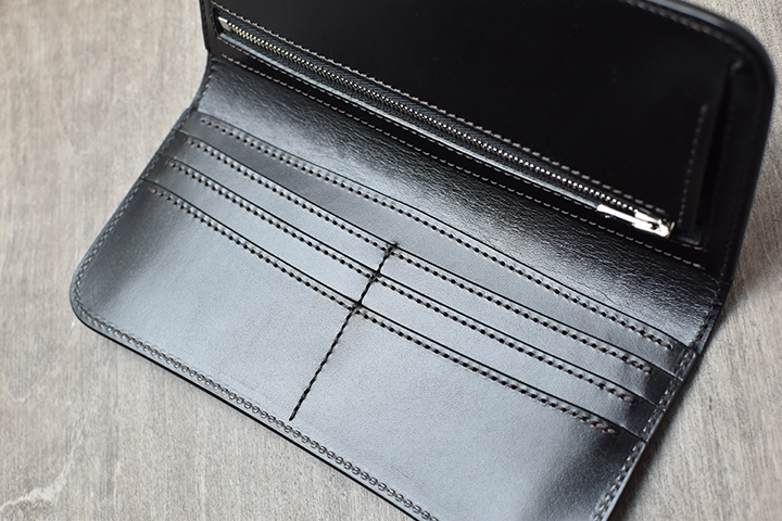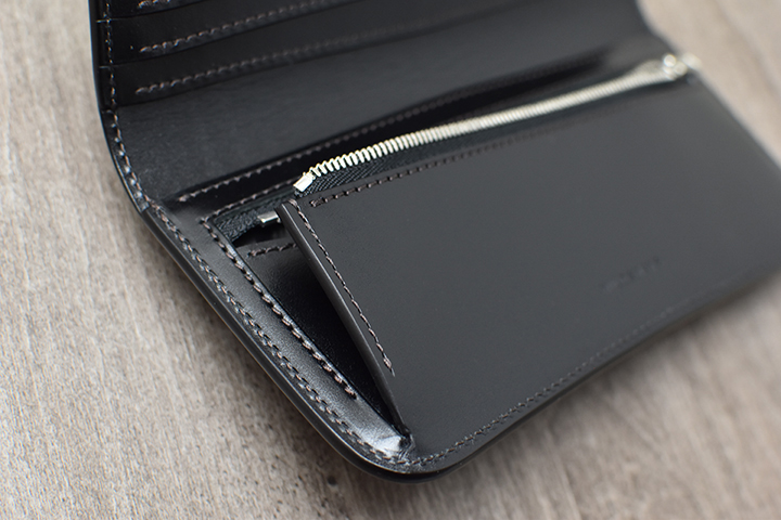 続いてコインケース側です。まずコインケースのファスナーには、SURFS1と同じエクセラファスナーを使用しています。ただし、BLISTER-Lのコインケースは舟形に開く特殊な仕様となり、マチが設けられていないにも関わらず、視認性が高く、取り出しやすい設計です。また、このコインケースの前面には2部屋のカードポケットも付属されています。
