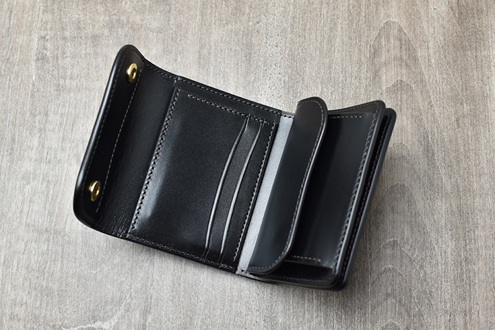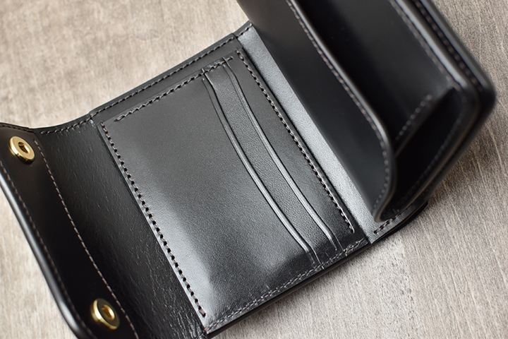 札室は本体のサイドに設けています。三つ折り財布ならではのゆとりのサイズ設計と札室内部も総革仕様であることから、紙幣の出し入れは非常にスムーズです。