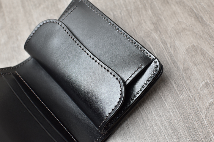 コインケースは、TONGUEと同じ位の大きさです。また、TONGUEと同様にフラップにはホックが2箇所付き、その内部には革の仕切りを設けています。このため、こちらはコイン以外にカードも収納して頂くことができます。