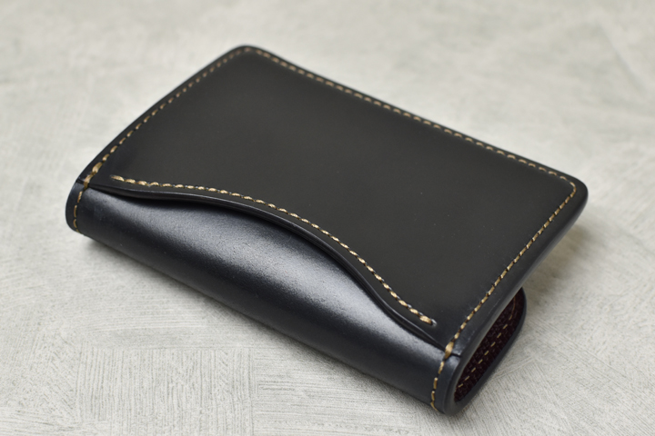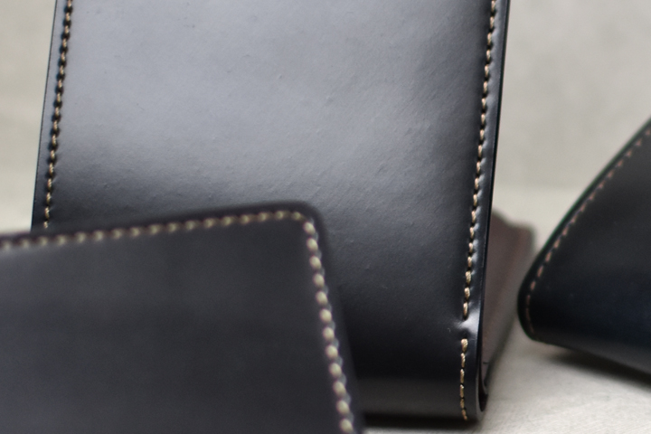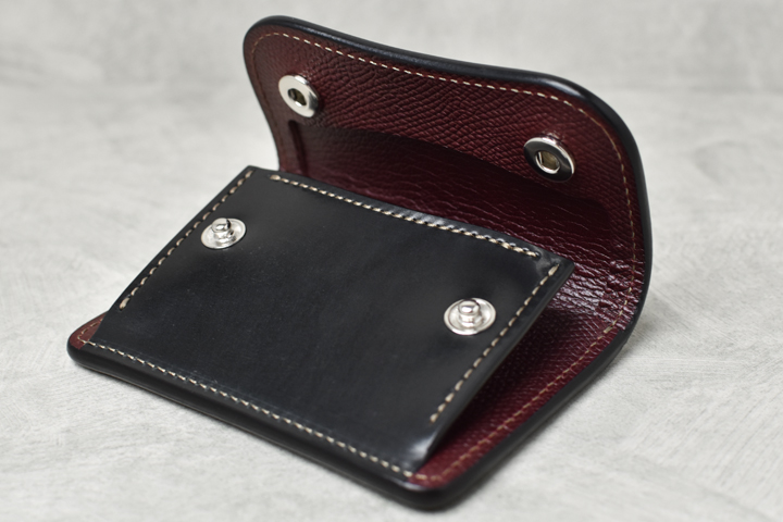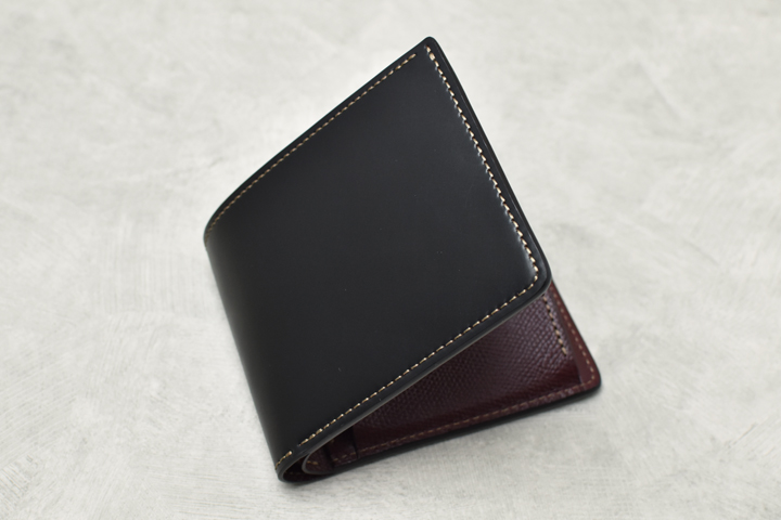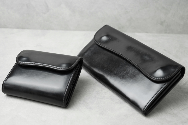 毎回ご好評を頂いているシェルコードバンシリーズ、今回は外装にシェルコードバンのブラック、内装には型押しのイングリッシュブライドルレザーのバーガンディを組み合わせた仕様にて4種のアイテムを製作致しました。