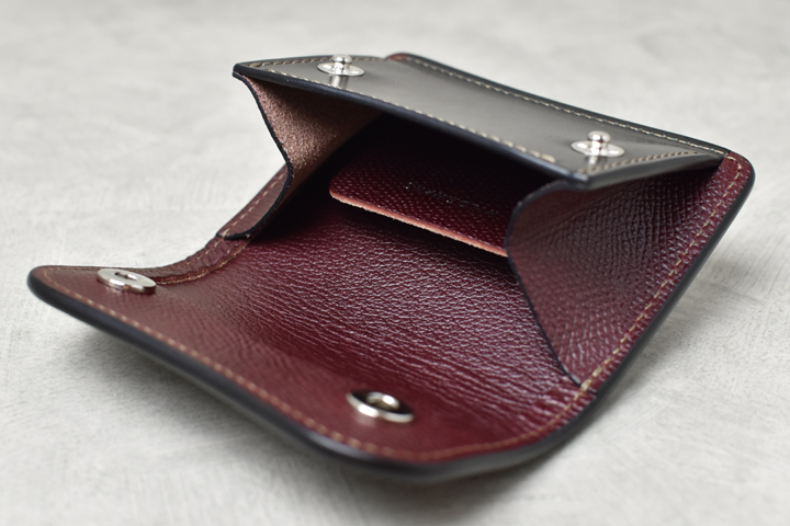本体のフラップは左右2点のホックで留められ、内装はそのままコインポケットになっています。