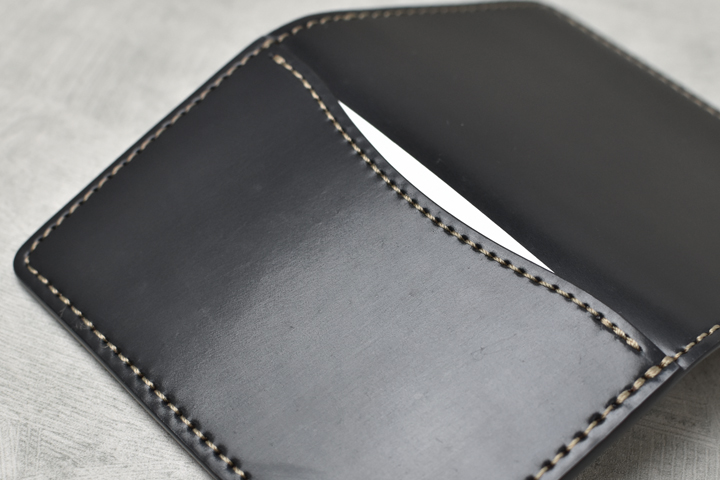 ロゴが刻印されている側にはマチなしのポケットが上下に2つ、それぞれ数枚の名刺を収納できます。