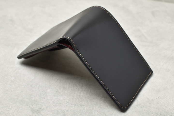 使い始めは革のハリで開きっぱなしですが、ご使用頂いていれば画像のような状態におさまります。
