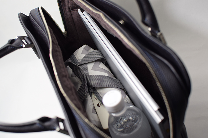 比較的細いマチのブリーフケースですが、ランチボックスやペットボトル、ノートパソコン、書類など、仕事に必要なあらゆるアイテムが収納できます。