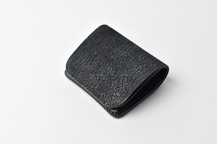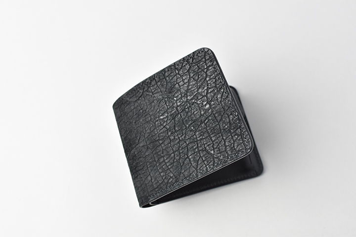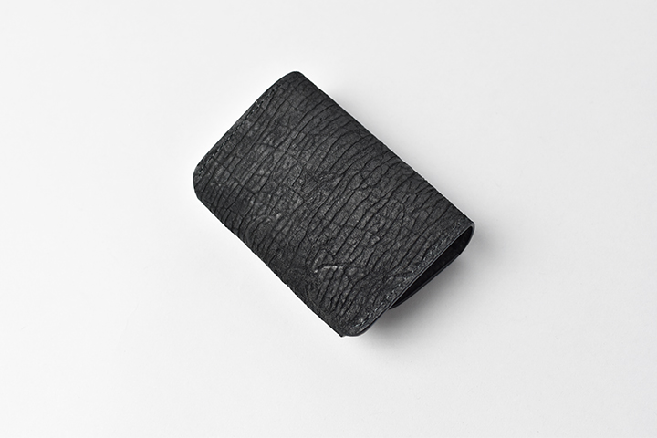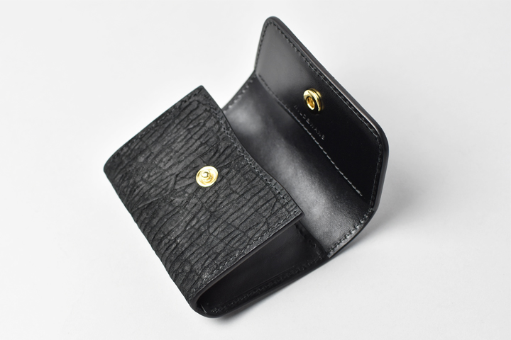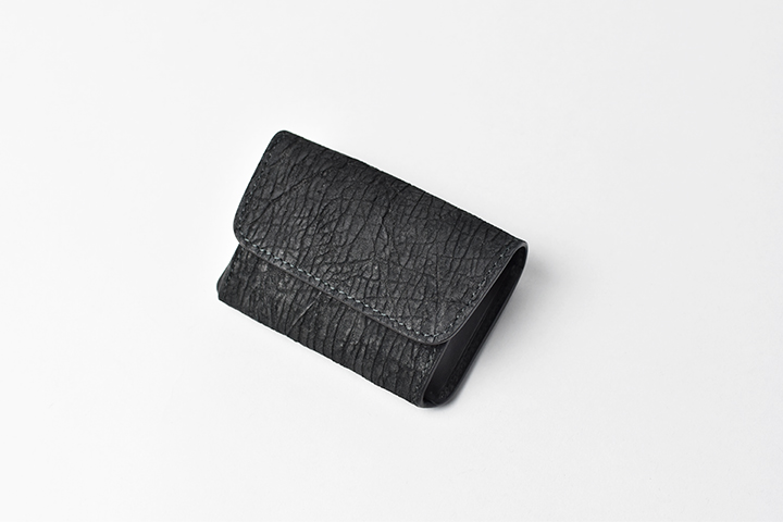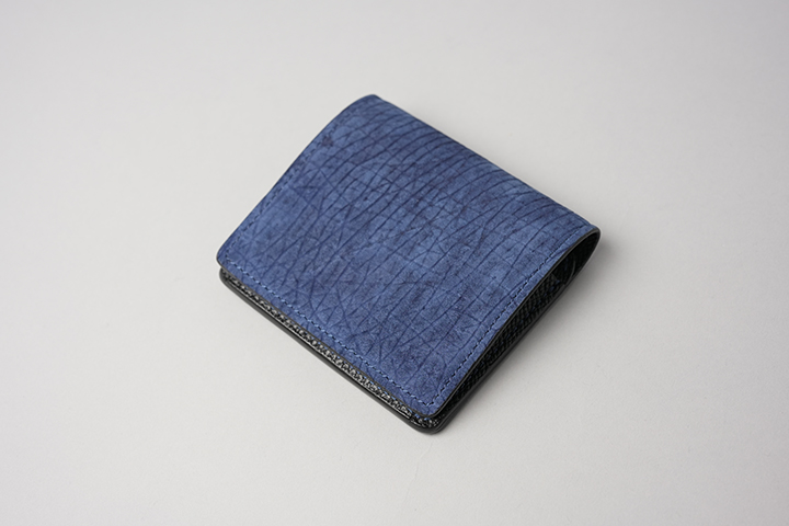 第二弾のアイテムをご紹介する前に、今回のブラックとは異なるヒポポタマスをご覧ください。こちらは藍染のヒポポタマスです。鮮やかなブルーを基調とした独特の色合いです。今回のシリーズではブラックのヒポポタマスを使用していますが、カラーによって全体の雰囲気が全く異なります。ちなみにこちらのモデルは、現在廃番となっているミニ財布のLACONIC(ラコニック)です。