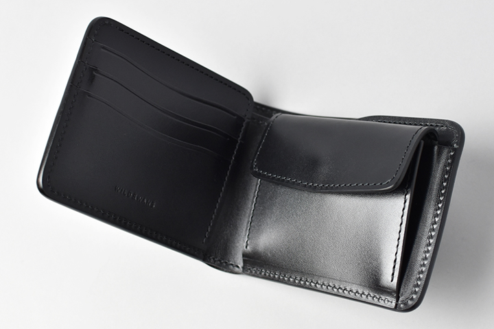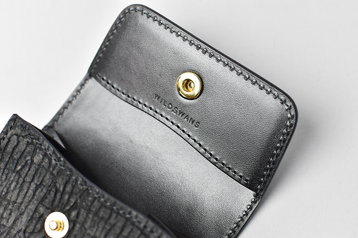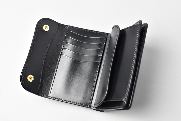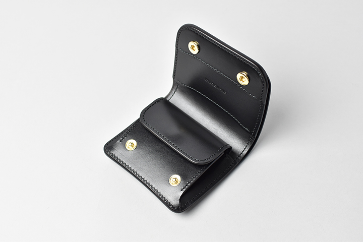 コインケースにも専用のホックが付いています。コインケースのフラップは大きなマチを前後に可動する特殊な仕様です。フラップの手前にコイン、背面にカードが基本的な収納パターンです。