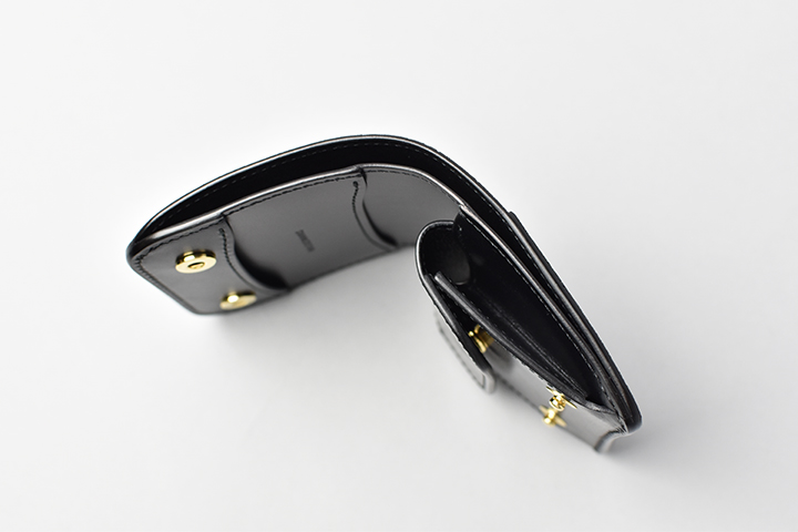 右側のコインケースはホック付きのフラップが付属します。こちらのホックはゴールドカラーとなります。内側のマチに比べて外側のマチを大きく設計することで、取り出しやすさにも配慮されています。また、コインケースの背面にはカードも収納できるポケットも用意しています。