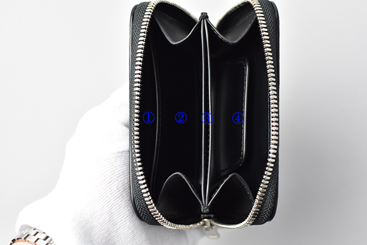 ④ 革の仕切り付き両マチ式収納部・・・カード、コイン、折りたたんだ紙幣