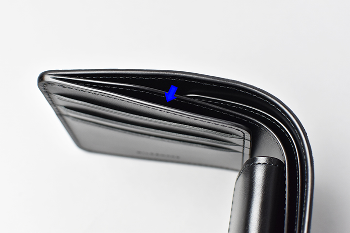 札室はカード収納部や、コインケースの奥に設けています。中には仕切りがあるので、紙幣の種類によって仕分けもできます。また、こちらの仕切りは仕切りの前後の収納量に差が出た際も、型崩れが起こらないように、仕切りの長さを全長の3/4ほどに留めています。