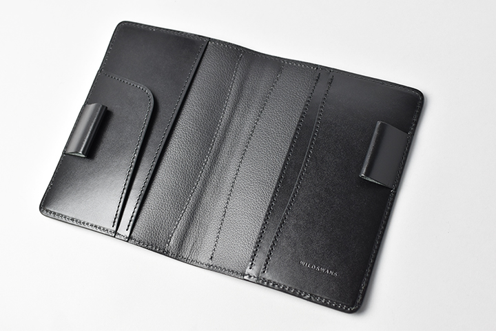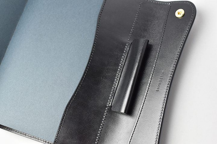 内装の両翼に付いたペンホルダーは、本体を閉じた時にペンを収納することで、留め具としての機能が生まれます。画像では以前サドルプルアップで製作したCANOPUSにカランダッシュのフロスティボールペン(軸径最大:約12mmφ)を挿し込んだ様子を掲載しています。