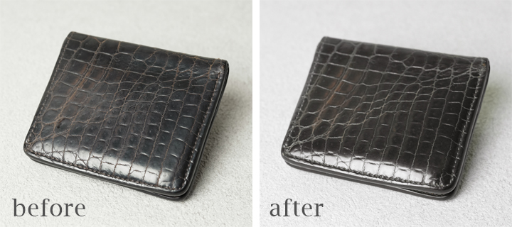 まずご紹介するのはWILDSWANSとCorbo.のチーフデザイナーである古瀬聡氏とのコラボレーション「Walkersシリーズ」から生まれたミニ財布・kf-003です。画像では表面と背面に分けてbefore&afterの様子を掲載しています。クロコに限らず、牛革でも汗や汚れ等による皮革表面の曇りは革製品のエイジングを妨げる要因の一つとなっています。こうした曇りの改善は簡単ではありませんが、木村氏は長年培った見識と技術により、見事に曇りを改善し、全体に鋭い艶を出しています。また、CHOCOLATEのカラーは、長年の使用により濃く変化しますが、曇りが取れたことによって、クロコの美しい色合いと艶がはっきりと表れています。