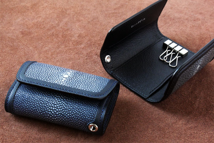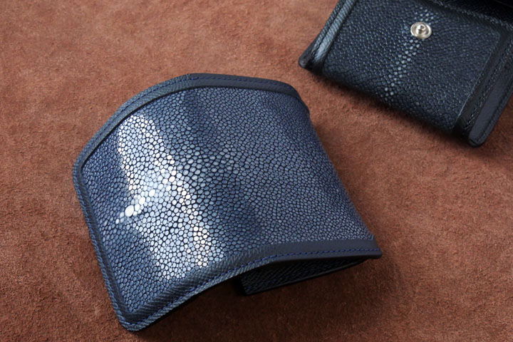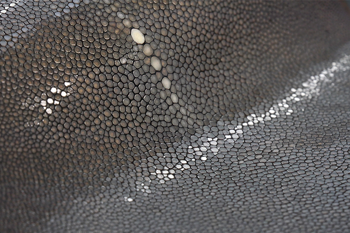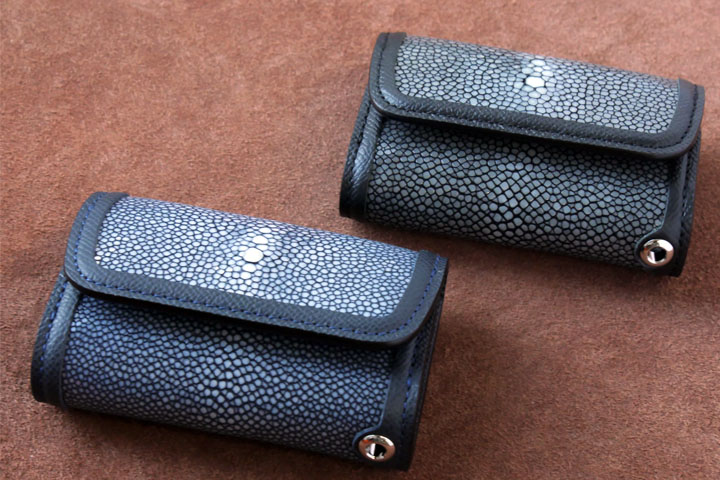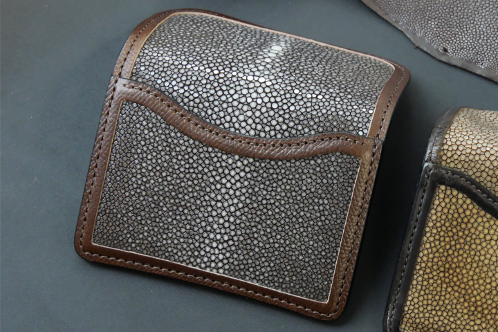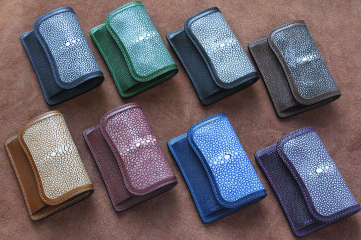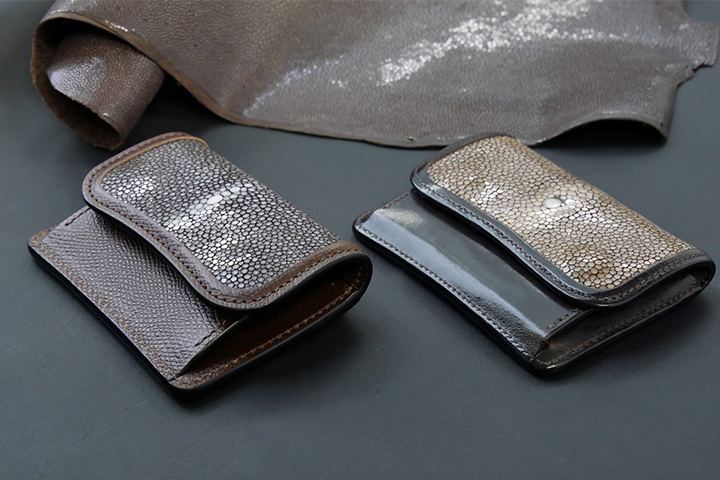 続いてご紹介するのは、WILDSWANSでは久しぶりの登場となるガルーシャシリーズです。ガルーシャとは海に生息するエイの革のことを指し、宝石のようなきらめきと滑らかな表面は、数あるエキゾチックレザーの中でもひと際異彩を放っています。