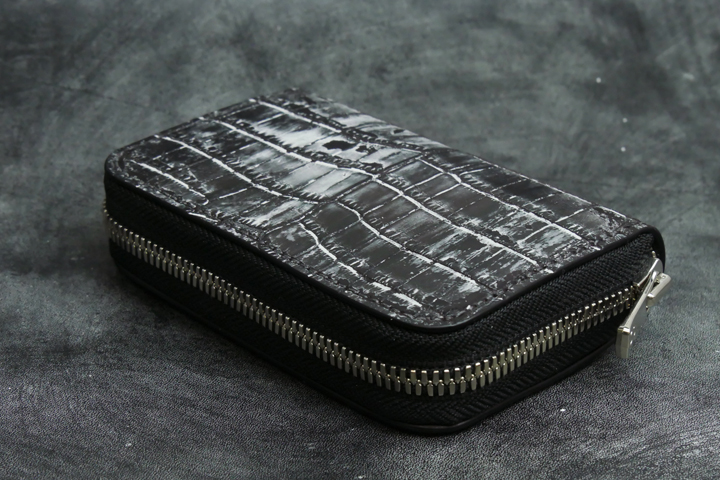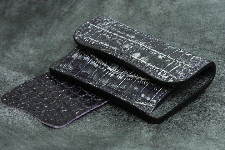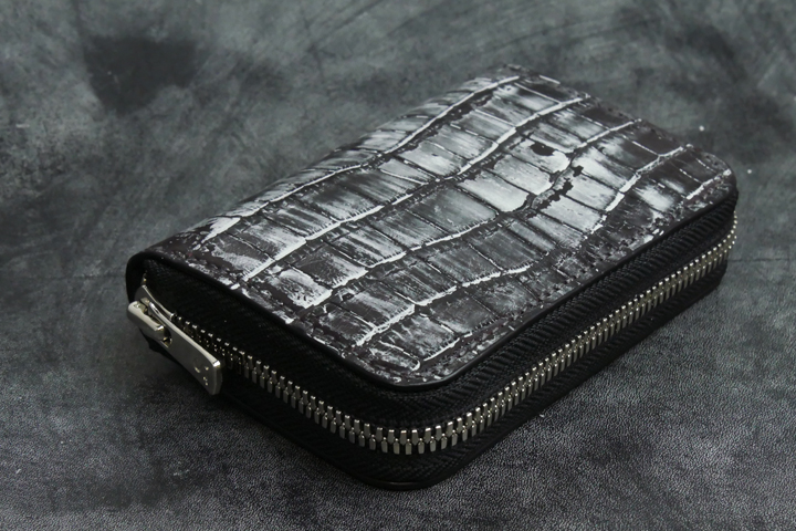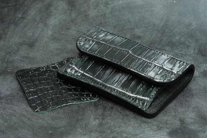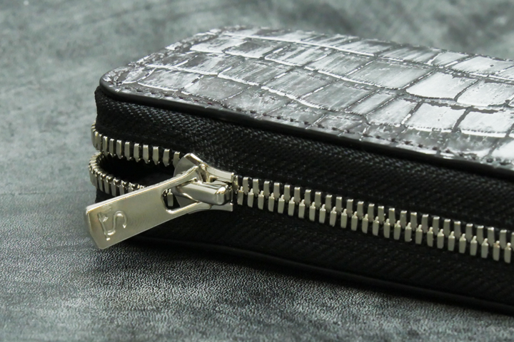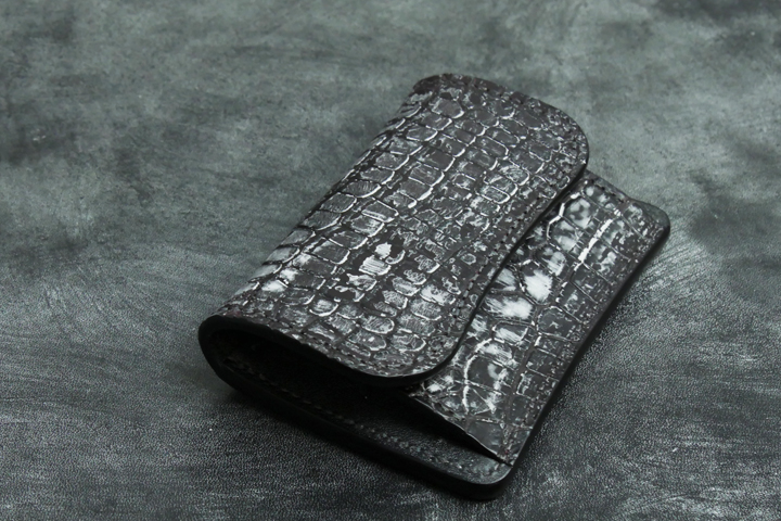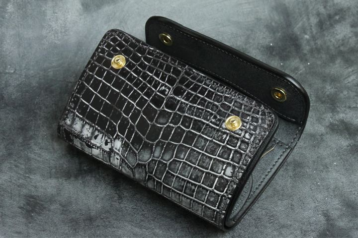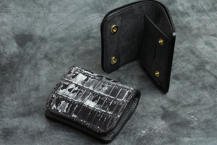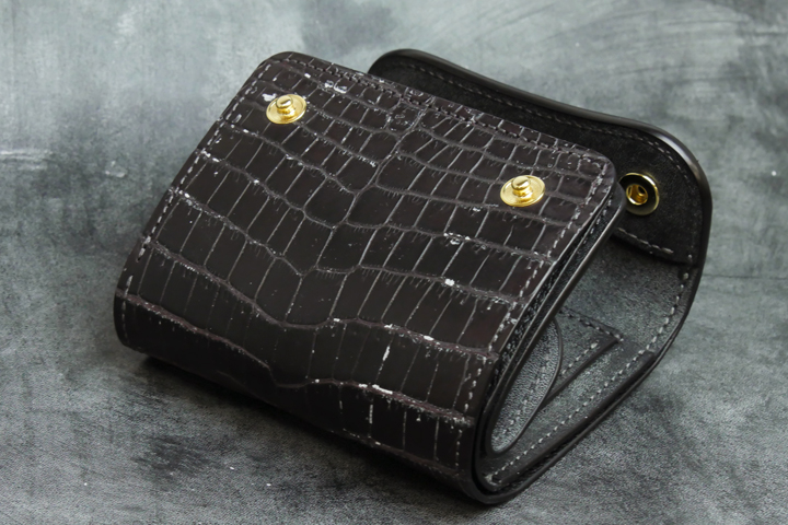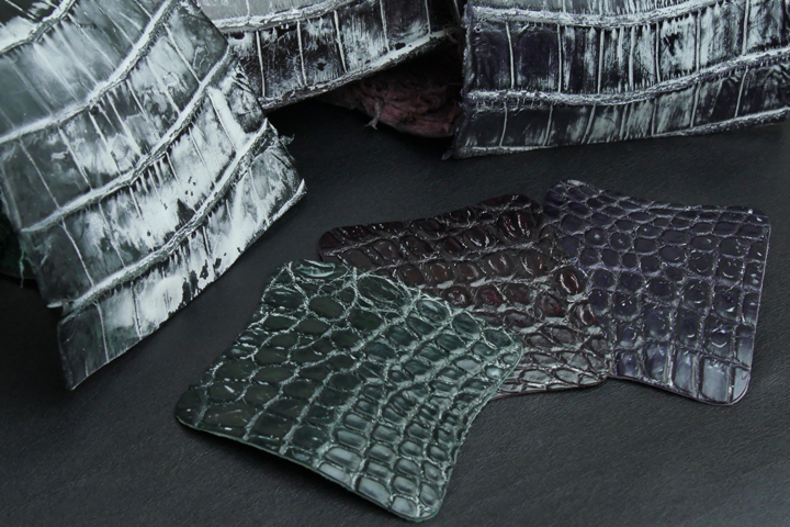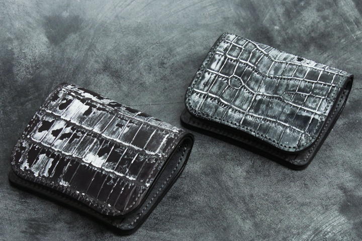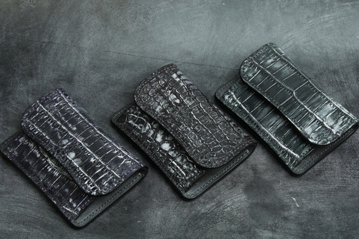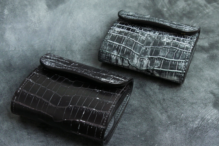 しかし、今回登場するブライドルクロコは文字通り、「クロコダイル」を用いた非常に珍しいブライドルレザーです。見た目はまさしくクロコダイルですが、牛革のブライドルレザーと同様に加脂、加蝋、染色の仕上げが施されており、革表面にはブルームと呼ばれる白い蝋分が噴き出ています。