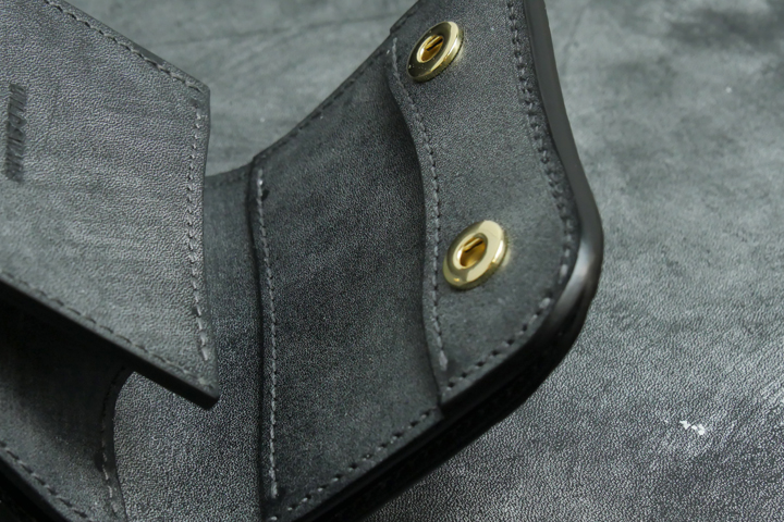 コインケースのフラップは、前後に動かすことで前後の収納量に応じた比率に変化します。