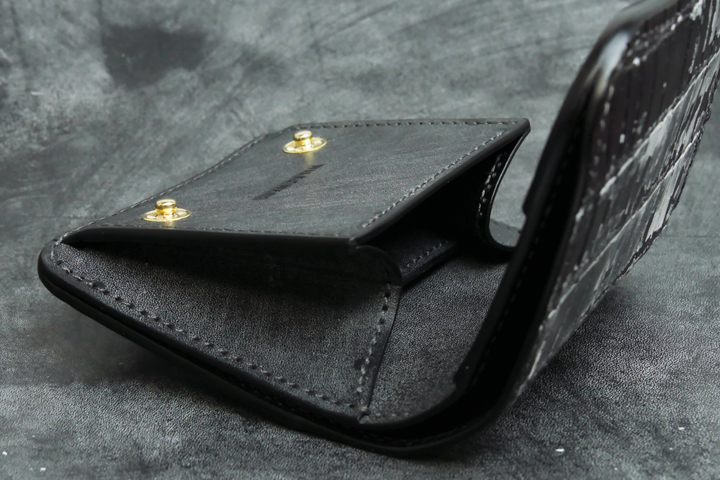 画像で使用しているのはクロコ/TONGUEのサンプル品ですが、使用を重ねることで革は馴染み、小銭などの出し入れもより容易になってまいります。