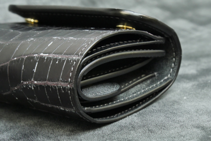 一般的なブライドルレザー同様、白いブルームは使用とともに消えていき、革表面の光沢は増していきます。クロコダイルのエイジングといえば鏡面のような美しい光沢が醍醐味の一つでもありますが、今回のブライドルクロコはより一層時間と手間をかけた仕上げにより、迫力のあるエイジングをお楽しみ頂けます。