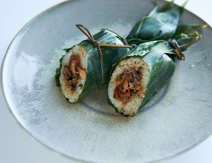 笹巻きご飯は、もち米と具材を笹の葉で包み、い草で結んだ後、蒸し上げるシンプルな料理。