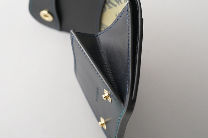 フラップは左右のホック2点によって本体に留められており、開くとコインケースの内装が現れます。