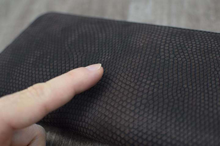 クロコダイル程ではございませんが当然ながらヌバックリザードも自然の素材を使用しているため斑の形状(大きさ)が微妙に1点1点異なります。