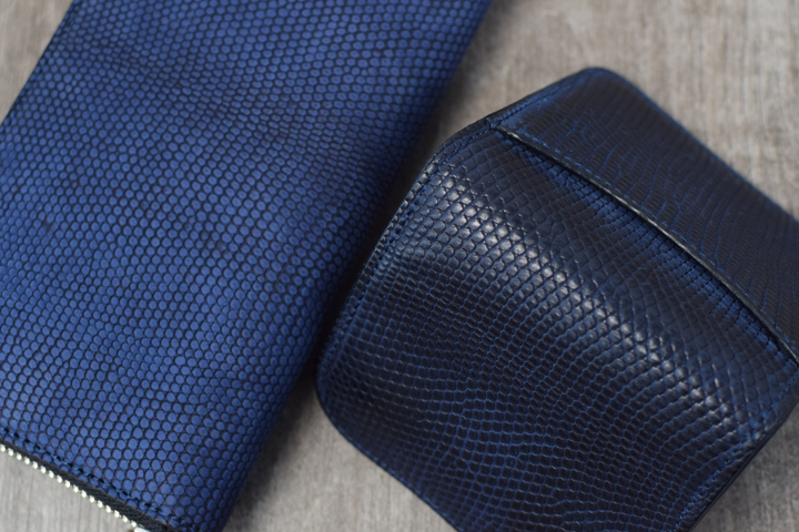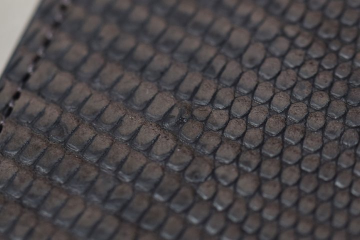 ヨーロッパの大手メゾンにエキゾチックレザーを供給することで知られるフランスのcompagnie des cuirs precieux社が生産するヌバックリザードは細かな丸型の鱗が印象的な非常に上品な皮革です。
