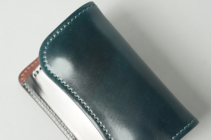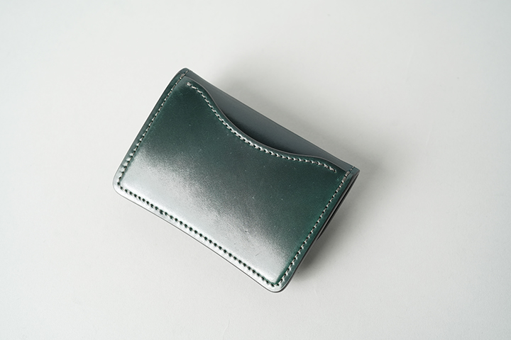 背面のカードポケットは、シェルコードバンのグリーンです。なお、こちらのTONGUEのステッチカラーには、チャコールグレーを採用しています。様々なカラーの皮革にマッチする万能なステッチカラーです。