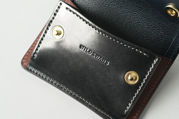 一般的な二つ折り財布よりも一回り大きなコインケースには、専用のホック(ゴールドカラー)が付きます。こちらにはコインだけではなく、カードの収納も可能です。内部は両側のマチ裏部分のみイングリッシュブライドルレザーのトコ面(=革の裏側)となっています。なお、コインケースの背面にもカードが1枚収納できるスペースをご用意しています。
