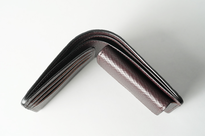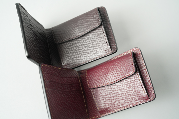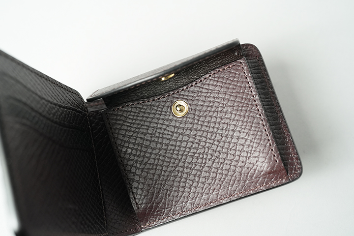 SHELLCORDOVAN / GROUNDERと同様に、内装には型押し加工を施したイングリッシュブライドルレザーを組み合わせています。ただし、ELEPHANT / GROUNDERの場合、1つの外装のカラーに対して2つの内装のパターンがあります。なお、内装の左に3段式のカード収納部、右にコインケースが配置されています。キズが目立ちにくい型押し革は、スムースレザーに比べて扱いやすく、フォーマルにも対応する素材です。